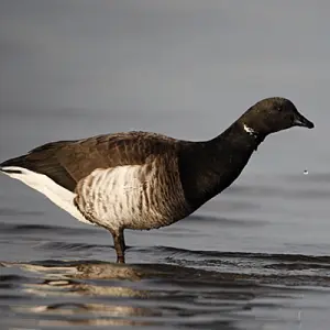 | English; | Black Brant | Black Brant Geese are birds from the Kile area in northeast Greenland, they aggregate with birds from Svalbard and Franz Josef Land to winter in Denmark and in Northumberland in England. They can be easily recognised by their black and white appearance on the flanks. | ![]() |