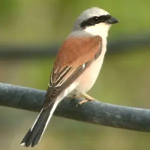 | English; | Woodchat Shrike | The woodchat shrike breeds in southern Europe, the Middle East and northwest Africa, and winters in tropical Africa. It breeds in open cultivated country, preferably with orchard trees and some bare or sandy ground. This migratory medium-sized passerine eats large insects, small birds and amphibians. Like other shrikes it hunts from prominent perches, and impales corpses on thorns or barbed wire as a "larder". This species often overshoots its breeding range on spring migration, and is a rare, but annual, visitor to UK. | ![]() |