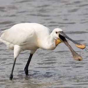 | English; | White Stork | The only instance of storks breeding in Scotland was when a pair nested on St Giles Cathedral in Edinburgh's Old Town in 1416. The Cotswold Wildlife Park has been running a successful breeding programme, and as a result about 250 birds are being released in Sussex via the White Stork Project with the aim of creating 50 breeding pairs by 2030. In 2020 eggs in one of three nests at the Knepp Estate in West Sussex hatched. Observers watched as the parents incubated the nest of five eggs located in an oak tree. Omnivorous storks stalk through grassland eating small mammals, snails, crickets, earthworms and large insects. | ![]() |
